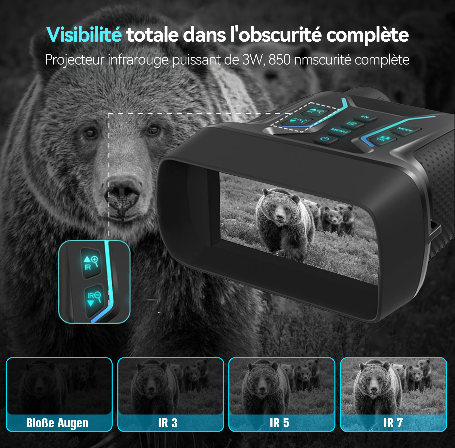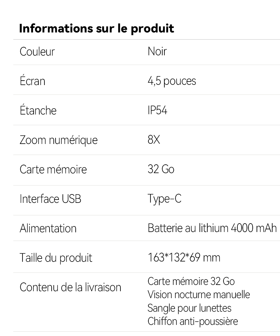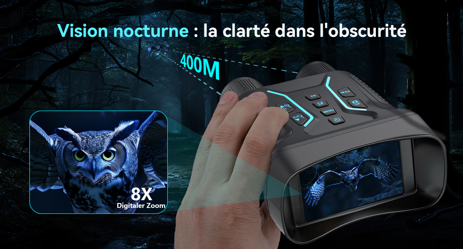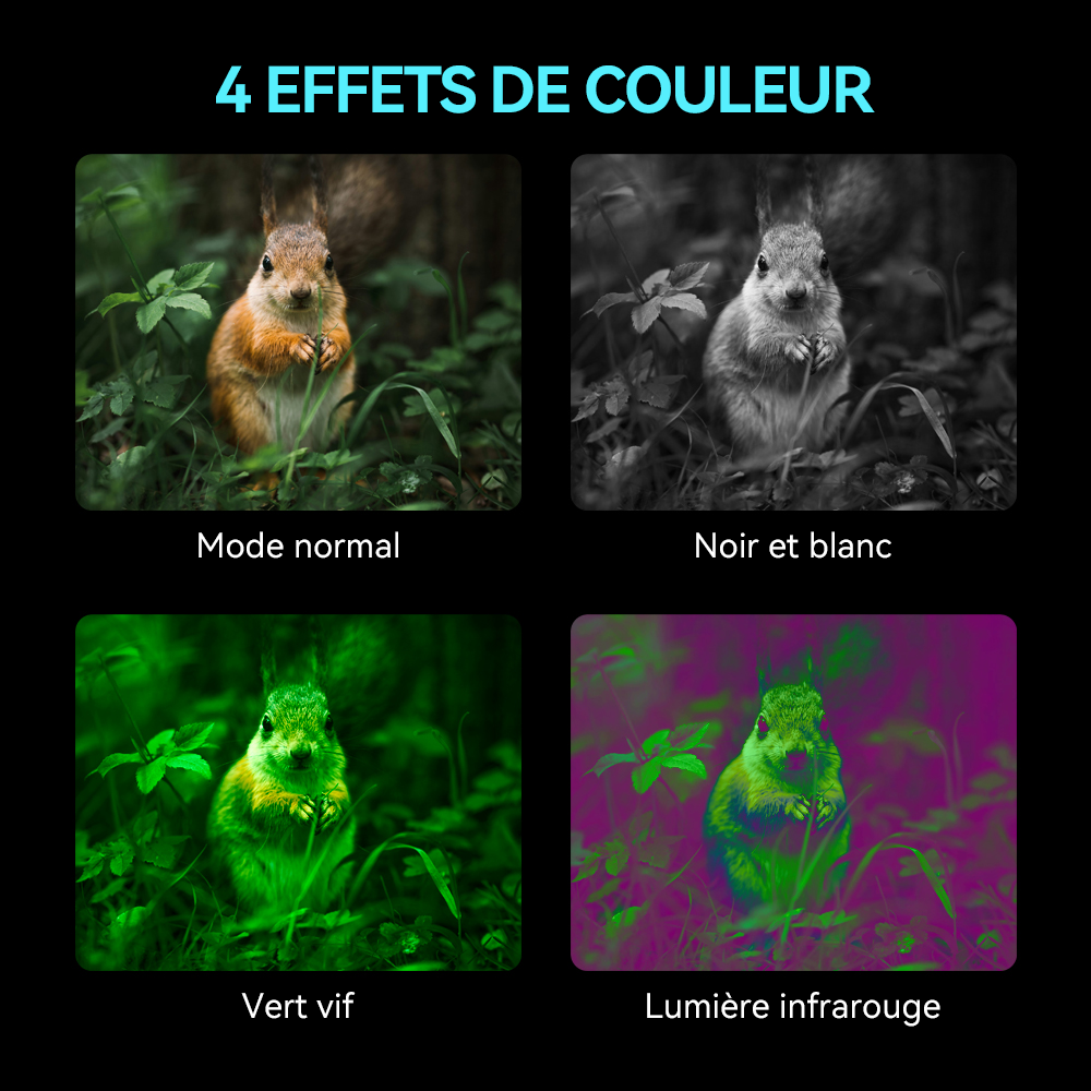 Cet appareil de vision nocturne dispose d'un zoom numérique 8x, vous permettant de capturer clairement des objets éloignés. Que vous effectuiez une surveillance ou observiez la faune, sa fonction de grossissement garantit une visibilité et une amplification améliorées.